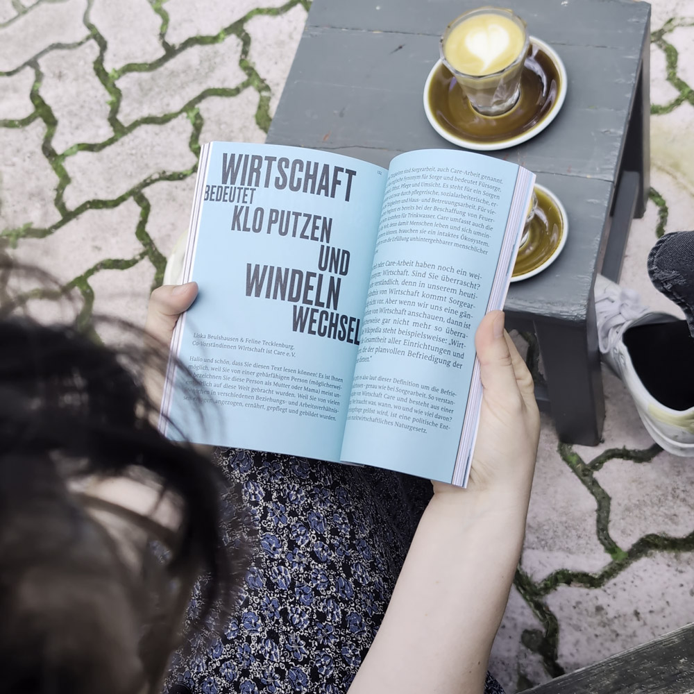 Das Programmheft für die Spielzeit 2025/26 des Hessischen Landestheaters Marburg hat das Thema „Take Care. füreinander miteinander“. WiC ist an diesem Projekt beteiligt. Zum Auftakt findet sich auf den Seiten 133 bis 138 des Programmhefts ein Text von Liska Beulshausen und Feline Tecklenburg: „Wirtschaft bedeutet Klo putzen und Windeln wechseln.“